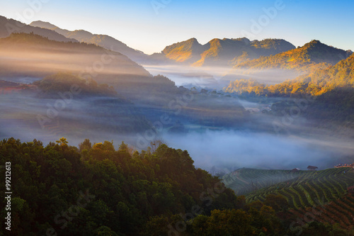 © sripfoto, Obraz premium Mglisty poranny wschód słońca na plantacji herbaty i chacie w Doi Ang Khang