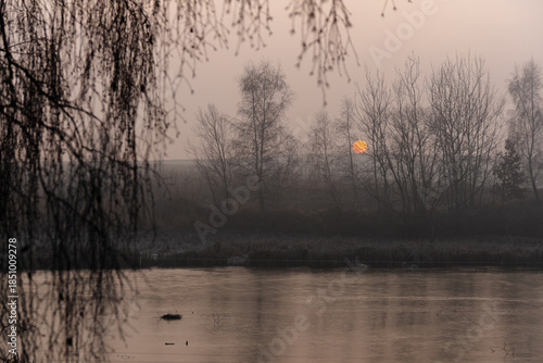 Fototapeta premium Mglisty zimowy wschód słońca nad stawem