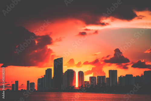 Naklejka premium Miami at sunset. Miami Beach South Beach, Florida, colorful skyline. Buildings with hotels and apartments near coastline near ocean. Sea at sunset. Ai Generative illustration