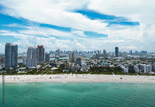 © Volodymyr, Obraz premium Miami beach, ocean drive summer cityscape. Miami Beach, South Beach, Florida, USA. Coastline, aerial view. Aerial view of high skyscrapers and ocean, Miami Beach, Florida, United States.