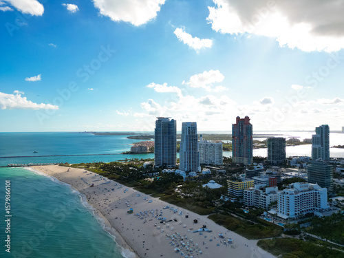 © Volodymyr, Naklejka premium Miami Beach skyline. Aerial drone shot of the Miami Beach. Aerial view of South Pointe Park and South Beach in Miami Beach. Miami skyline on a summer day.