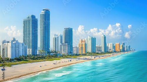 Naklejka premium Miami Beach skyline featuring The Setai and other prominent hotels near South Beach, showcasing luxury living, ocean views, and a bustling coastal cityscape on a summer day