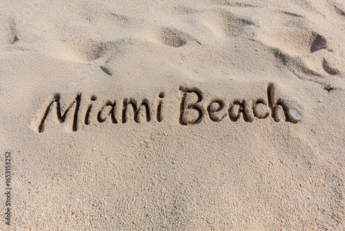 Fototapeta premium Miami Beach Text Carved Into Sand On A Sunny Day In Florida Vacation Destination
