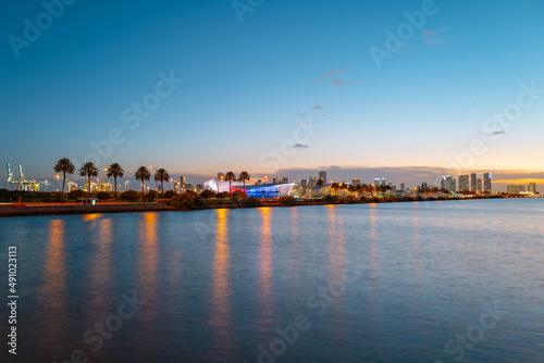 Fototapeta premium Miami city. Miami skyline panorama at dusk with skyscrapers over sea. Night...