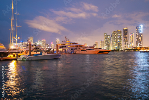 © Volodymyr, Fototapeta premium Miami, Florida cityscape skyline on Biscayne Bay. Panorama at dusk with urban skyscrapers and bridge over sea with reflection.