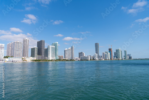 © be free, Fototapeta premium Miami, Florida USA - April 15, 2021: metropolis cityscape of city downtown with skyscrapers and sea