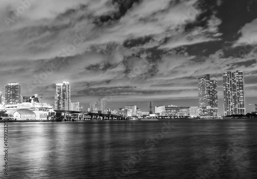 © jovannig, Naklejka premium Miami, Floryda - 27 lutego 2016: Panoramę miasta w nocy. Miami co roku przyciąga 15 milionów turystów