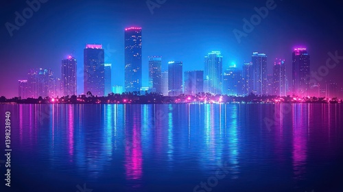 Obraz premium Miami Nightscape: Neon City Skyline Reflected in Calm Waters