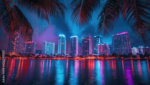 Obraz premium Miami skyline at night, neon lights reflecting on water, palm trees