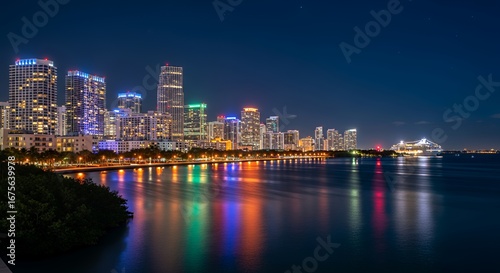 © Pemburu, Fototapeta premium Miami Skyline at Night - Vibrant City Lights Reflecting on the Bay.
