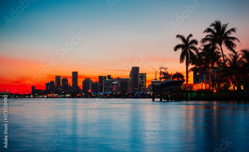 Obraz premium miami skyline at sunset florida palm downtown water sea boat