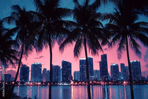 © Generative AI, Obraz premium Miami Skyline at Sunset with Palm Trees Silhouetted Against Pink and Blue Sky Reflected in Water : Generative AI