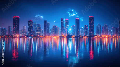 © tong2530, Fototapeta premium Miami skyline captured during a fireworks display, with reflections shimmering in Biscayne Bay