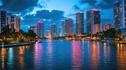 © CamBot, Obraz premium Miami Skyline Night View: Illuminating Cityscape Reflecting on Calm Waters