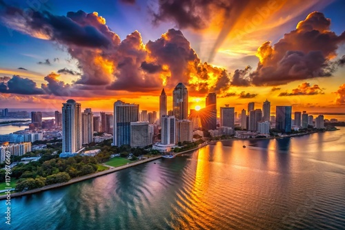© prapatsorn, Obraz premium Miami Skyline Silhouette at Sunset - Drone Photography