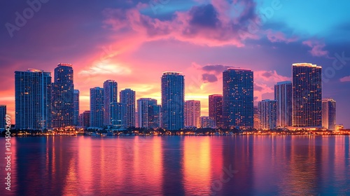 Fototapeta premium Miami Skyline Sunset: A Vibrant Cityscape at Dusk