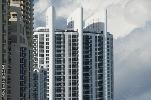 Obraz premium Miami. Skyscraper with reflective windows, cloudy sky. Tall building, curtain...