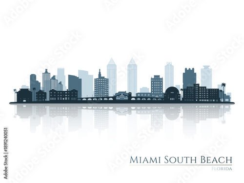 Fototapeta premium Miami South Beach skyline silhouette with reflection. Landscape Miami South Beach, FL. Vector illustration.