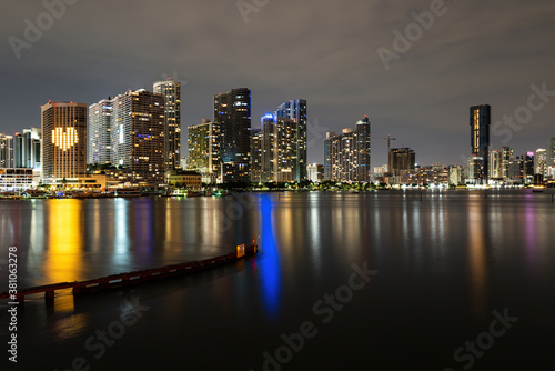 © Volodymyr, Naklejka premium Miami sunset panorama with colorful illuminated business and residential buildings and bridge on Biscayne Bay. Miami skyline on Biscayne Bay, city night backgrounds.