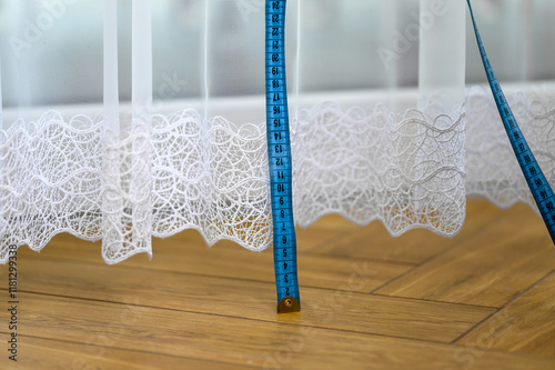 Obraz premium Miara zwisająca wzdłuż firanki, mierzyć odstęp firanki od podłogi