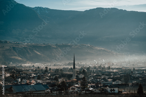 Obraz premium Miasto w dolinie pokryte mgłą pomiędzy górami