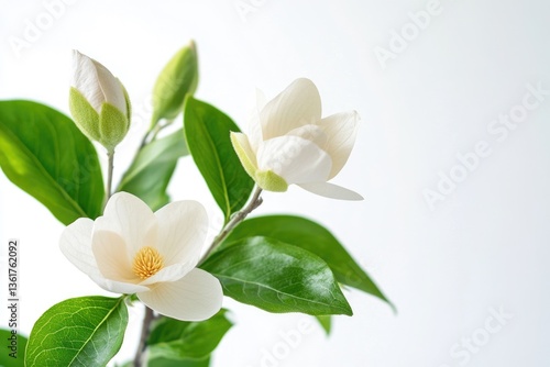 © Maryna, Fototapeta premium Michelia Alba Flower: White Blooms and Green Leaves on Spring Background