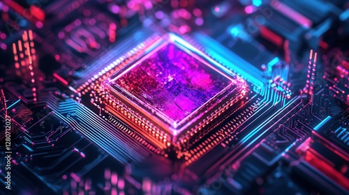 © Athirat, Obraz premium microchip, using light-based computing to process data at quantum speeds, revolutionizing artificial intelligence and deep learning models.
