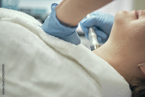 © Bogdan, Obraz premium Microcurrent technology equipment. Body, face, decollete, chin, nose, forehead. professional skin care in a cosmetology salon. Beautiful, clean skin
