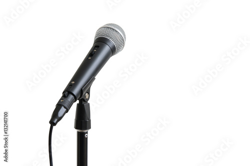 © vchalup, Obraz premium Microphone on stand isolated on white background.