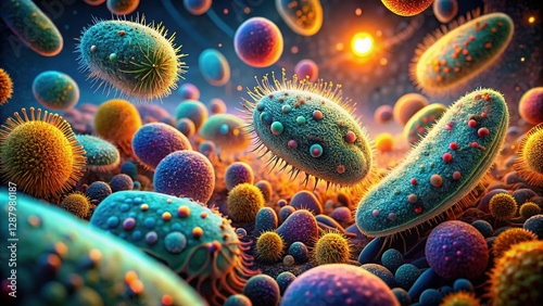 © Oliver, Naklejka premium Microscopic 3D Render of Bacteria Colony, Detailed Science Illustration