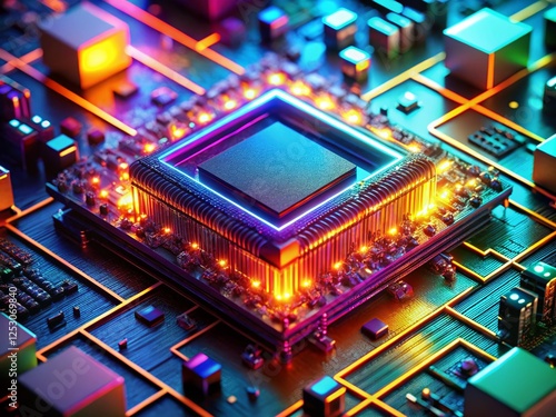Fototapeta premium Microscopic Drone Shot: Glowing Silicon Chip Close-Up - High-Tech...