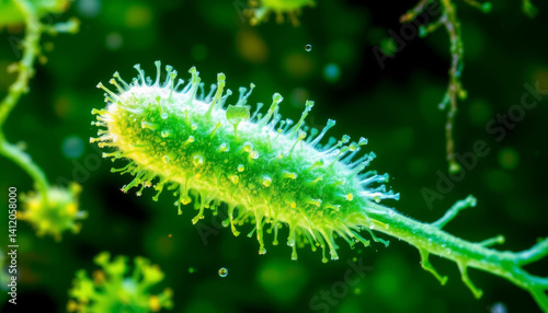Fototapeta premium Microscopic green bacteria with hair like structures, showcasing intricate details and vibrant