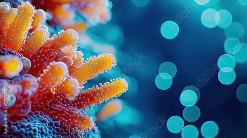 © PBMasterDesign, Naklejka premium Microscopic ocean life microscopic concept. Close-up of vibrant coral with soft blue bokeh background, showcasing underwater beauty.