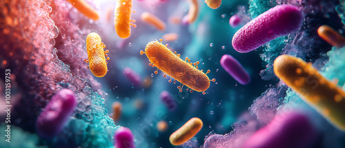 © Nantana, Fototapeta premium Microscopic view of colorful bacteria in vibrant environment, showcasing their unique shapes and structures