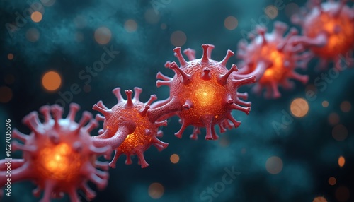 Fototapeta premium Microscopic view of interconnected, glowing red virus particles with spike proteins. Abstract biological illustration visualizes pathogenic cells medical concept with vibrant colors, soft bokeh