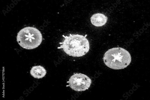 Naklejka premium Microscopic view of multiple, round, crystalline structures. Dark...