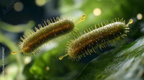 © Namdang, Naklejka premium Microscopic View of Unique Bacteria on Green Colorful Background
