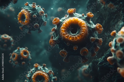 © D, Obraz premium Microscopic View of Viral Particles in Deep Ocean Environment for Scientific Illustration