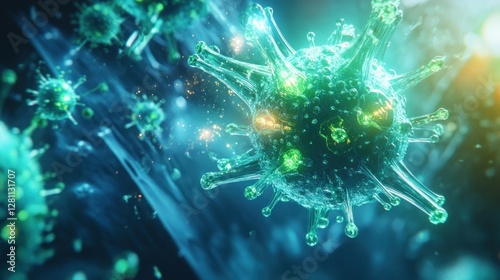 Obraz premium Microscopic view of virus particles, glowing in blue and green, with...