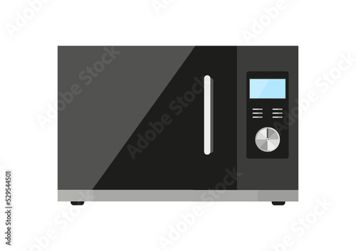 © VartB, Obraz premium Microwave oven cooking warming glass black flat. Fast cooking automatic timer display button control mode baking equipment kitchen pro household simplification smart home appliance phone isolated