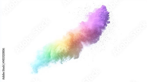 Fototapeta premium Mid air rainbow dust powder explosion isolated pure white background scattered colorful pigment bursts clean crisp detail high resolution dynamic motion freeze no shadow