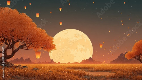 © Nguyen, Naklejka premium Mid-Autumn Festival Asian Backgrounds in Illustrated and Watercolor Style