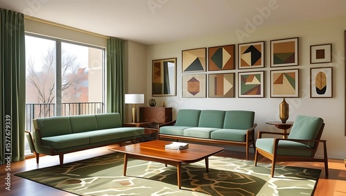 © Minami, Fototapeta premium Mid-Century Modern Apartment Living Room with Warm Tones and Minimalist Furniture