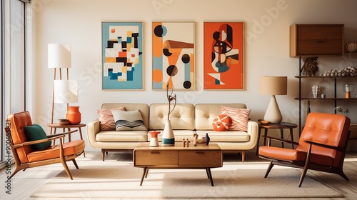 Obraz premium Mid-Century Modern Living Room with Geometric Art