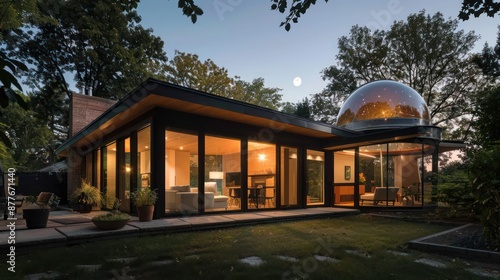© Ramzan, Obraz premium Mid-century modern suburban home with a backyard observatory dome for stargazing