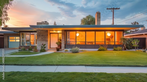 © Salman, Fototapeta premium mid-century modern suburban house with original 1950s decor preserved inside, visible through expansive front windows
