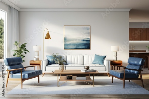© Md Shahjahan, Fototapeta premium Mid-century style interior design, White sofa, Blue leather chairs, Wooden coffee table.