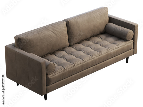 © 3dmitruk, Obraz premium Mid-century tufted brown leather upholstery sofa with roller pillows. 3d render.