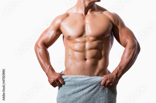Fototapeta premium Mid section of a shirtless muscular man in white towel