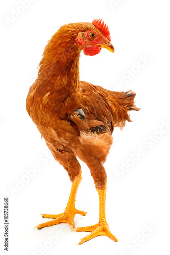 Fototapeta premium Mid-sized brown pullet standing on white